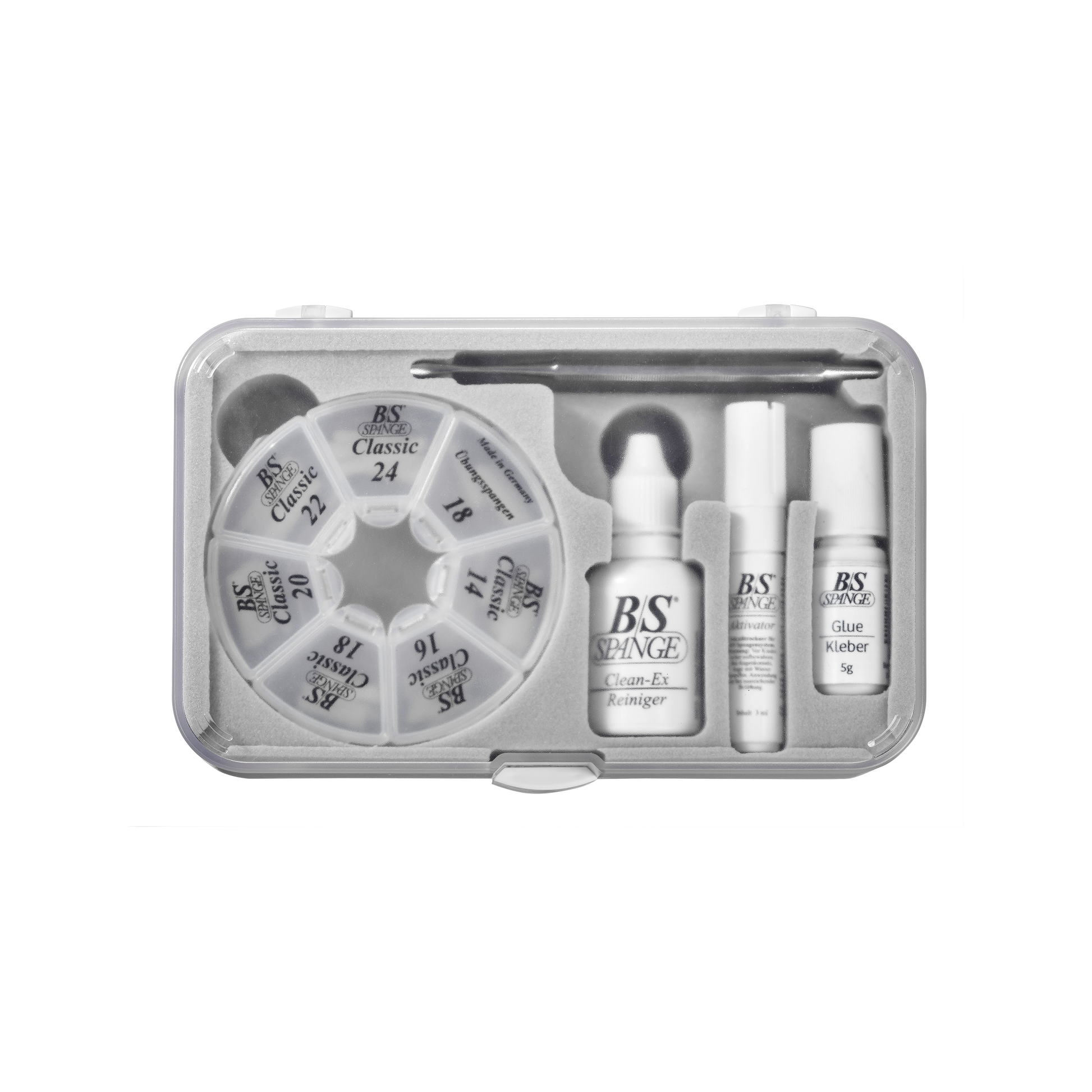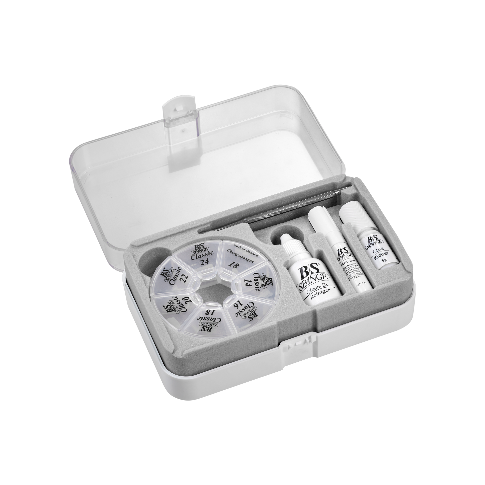 Dieses Set enthält 60 Stk. B/S Spange Classic mit einer Breite von 3 mm in allen Größen 14, 16, 18, 20, 22 und 24 à 10 Stück, plus zusätzlich 5 Übungsspangen in Größe 18. Sowie das komplette Zubehör für eine direkte und unkomplizierte Anwendung in der Praxis.