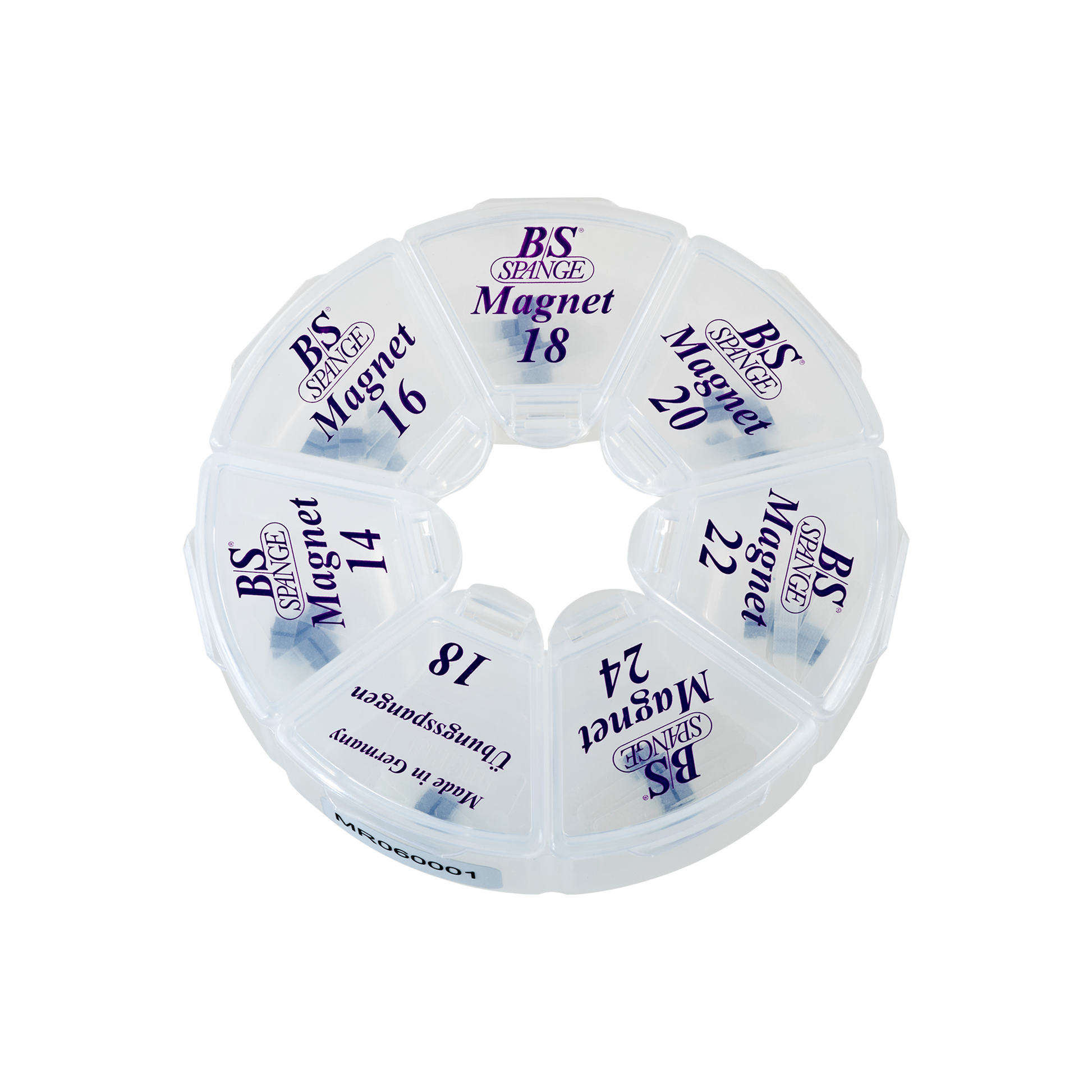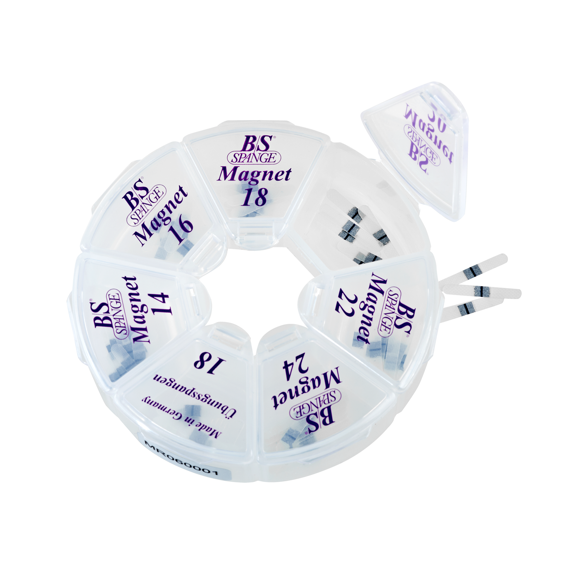 Das B/S Spange Magnet Profi Rondell enthält 60 Stk. B/S Spange Magnet mit einer Breite von 3 mm in allen Größen 16, 18, 20 und 22 à 10 Stück, sowie zusätzlich 5 Übungsspangen in Größe 18.