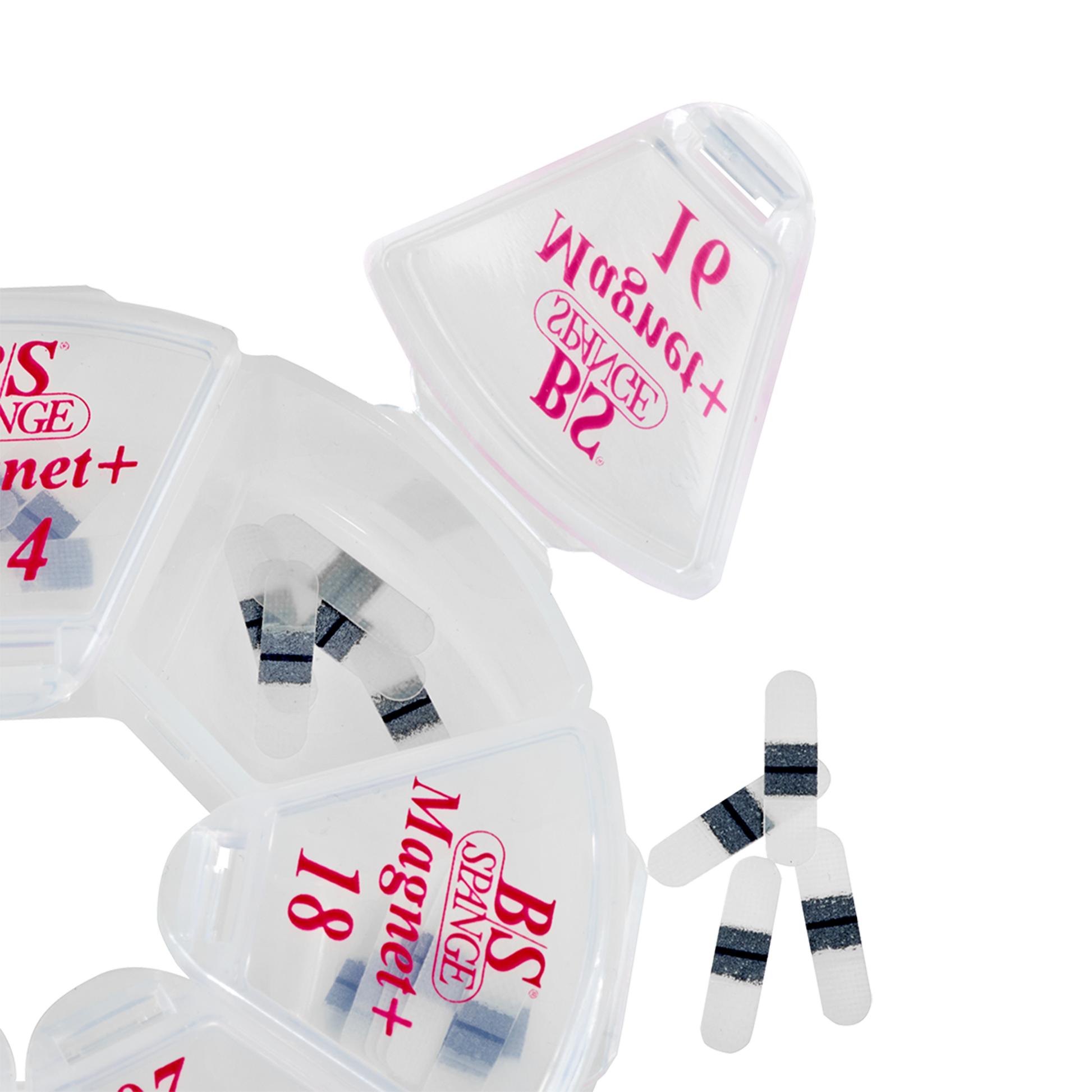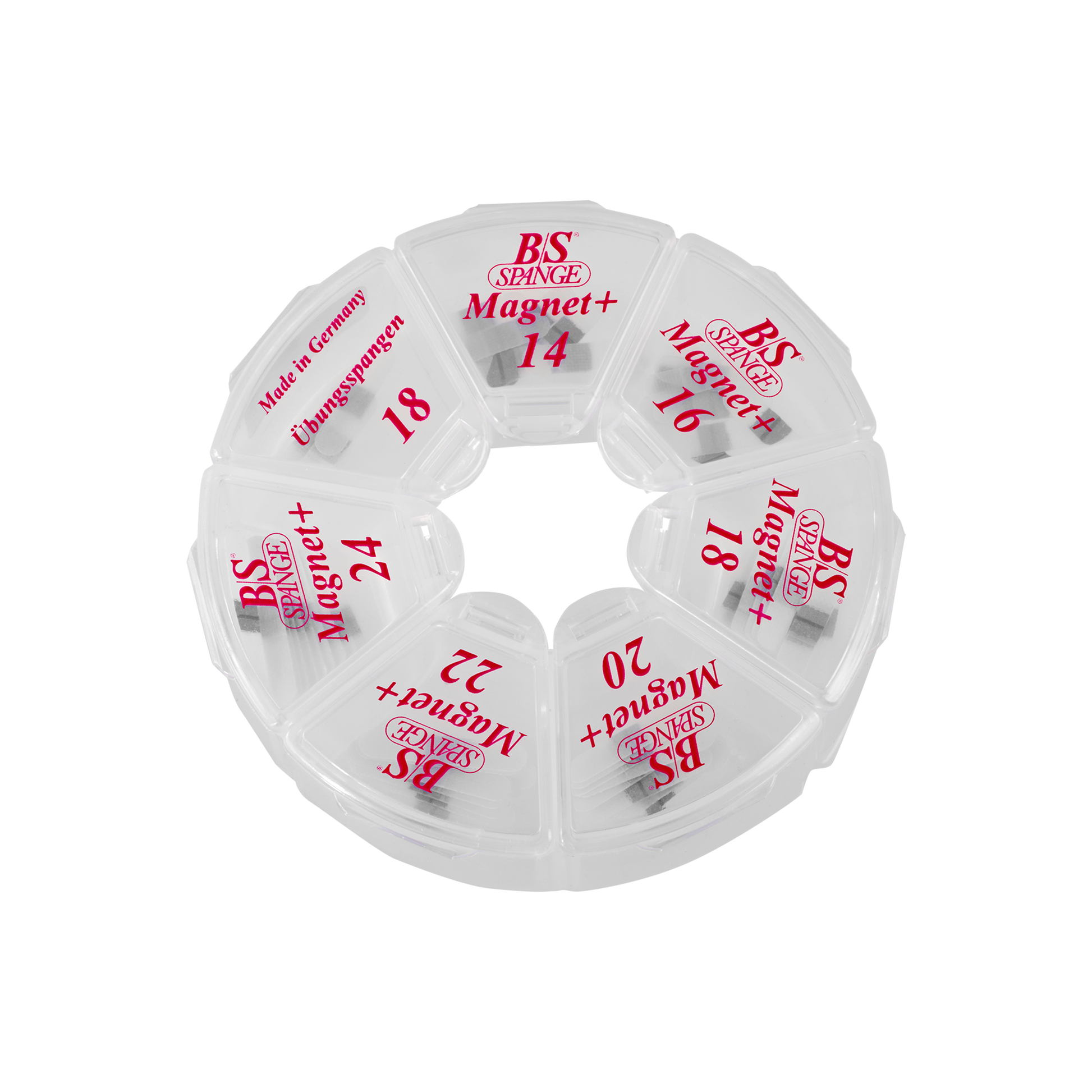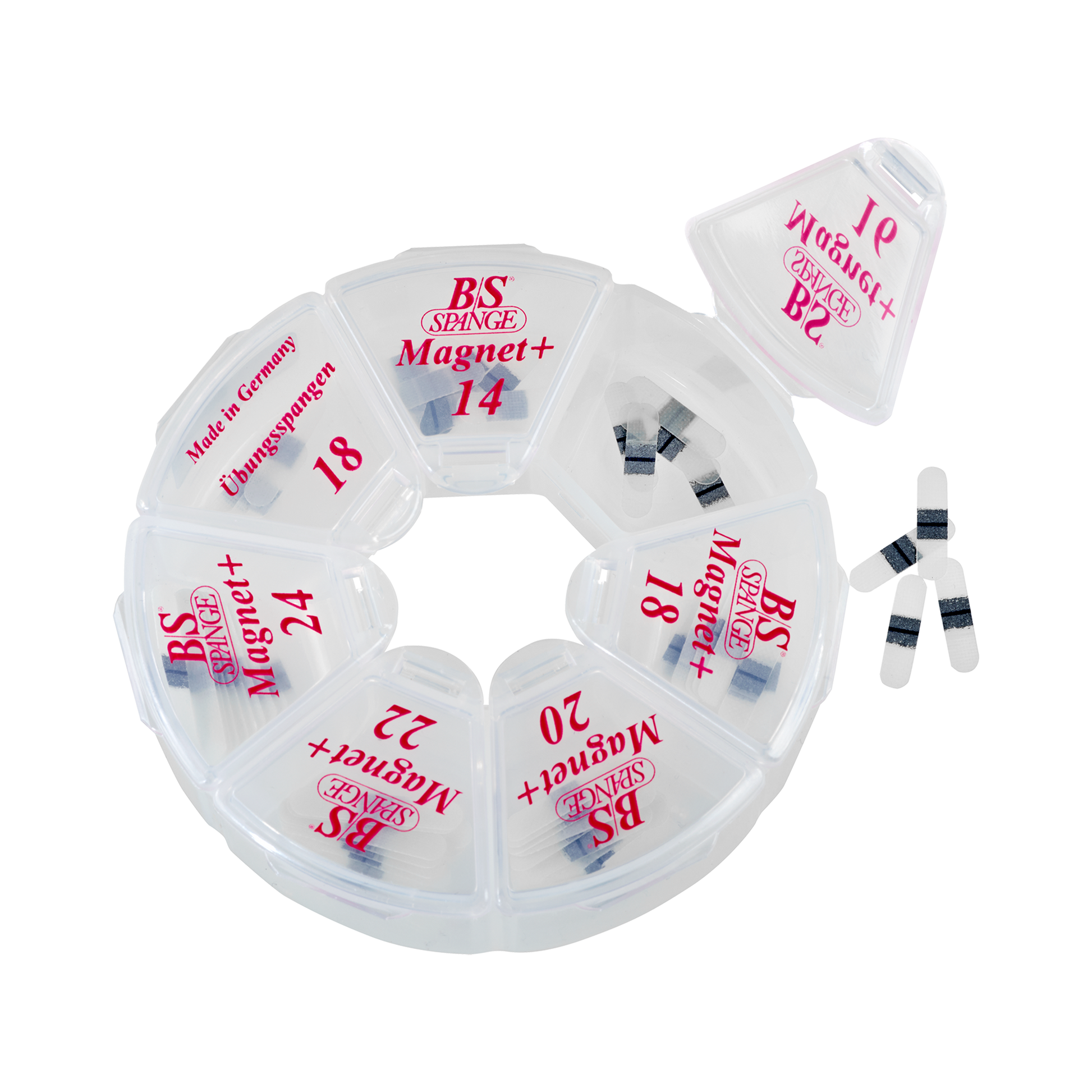 Das B/S Spange Magnet Profi Rondell enthält 60 Stk. B/S Spange Magnet mit einer Breite von 3 mm in allen Größen 16, 18, 20 und 22 à 10 Stück, sowie zusätzlich 5 Übungsspangen in Größe 18.