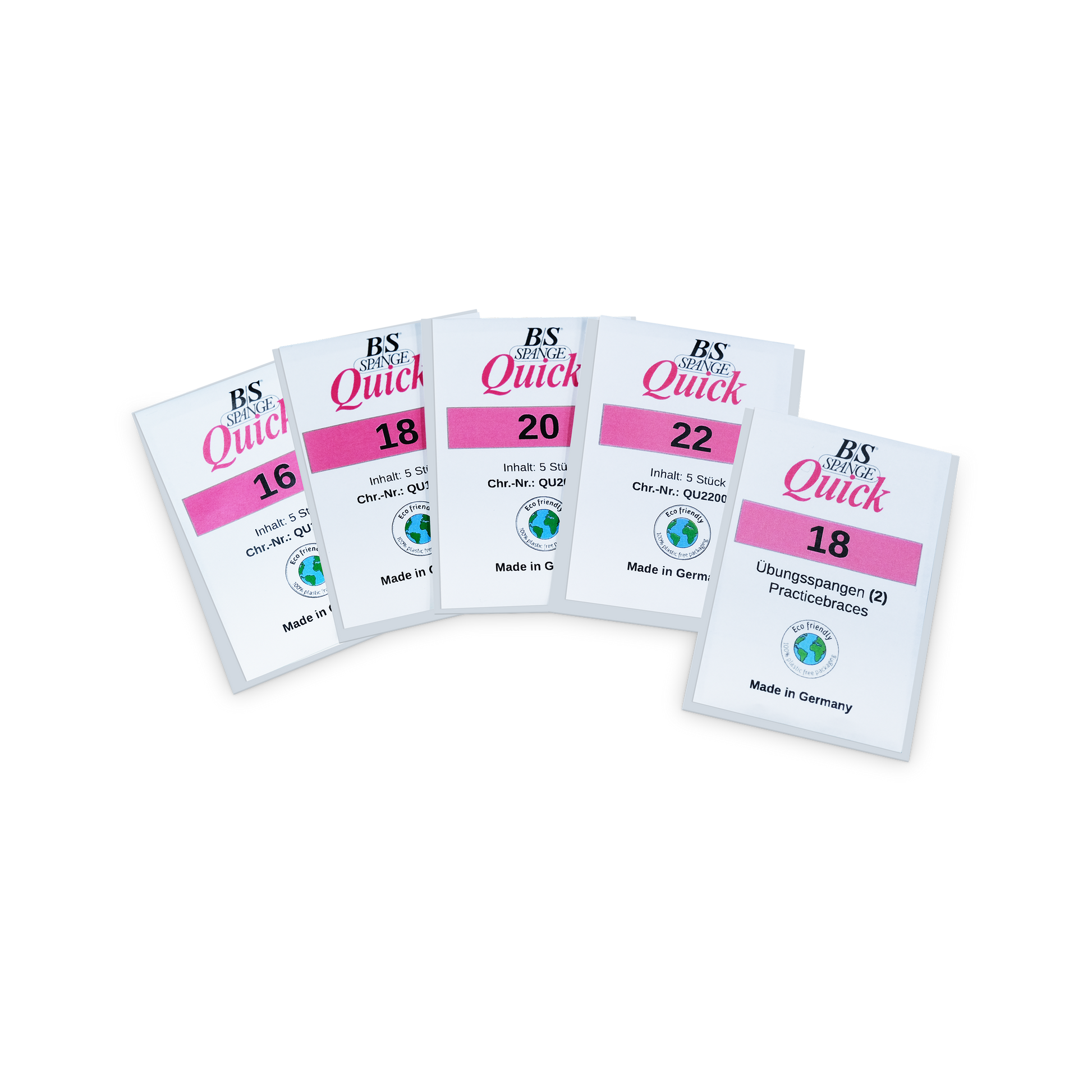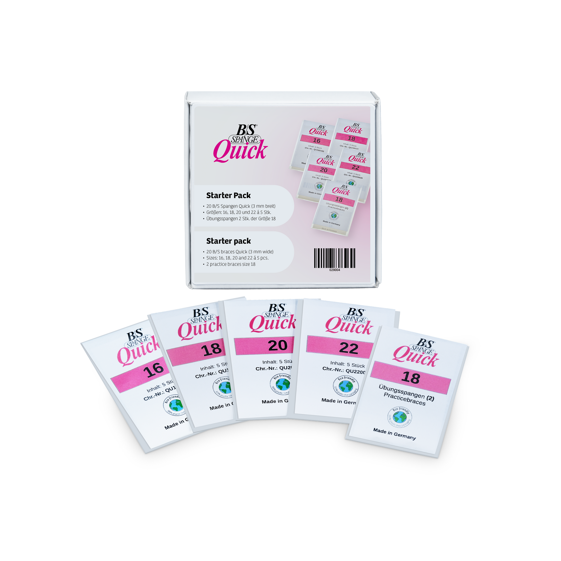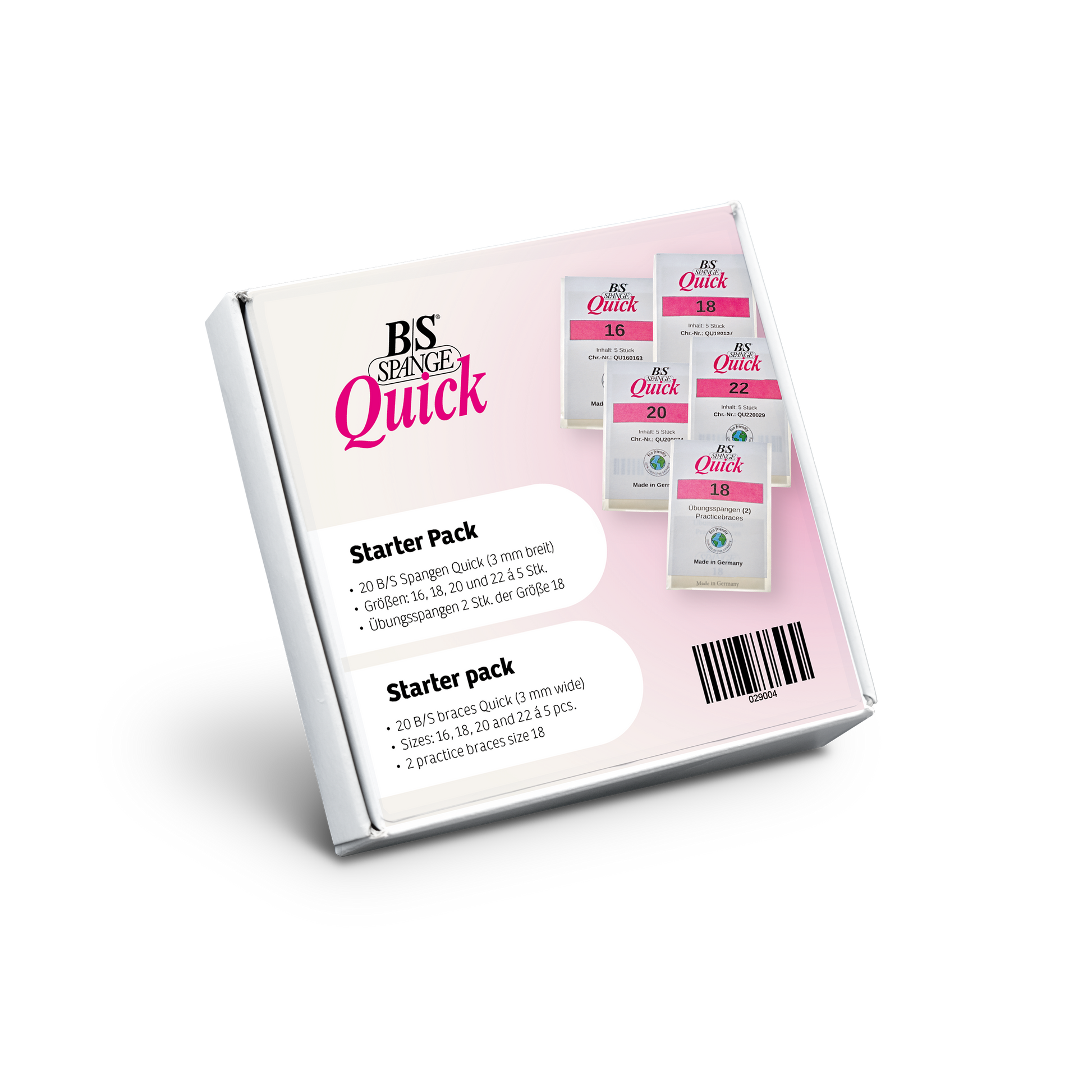 Das B/S Spange Quick Starter Pack enthält 20 Stk. B/S Spange Quick mit einer Breite von 3 mm in den gängigsten Größen 16, 18, 20 und 22 à 5 Stück, sowie zusätzlich 2 Übungsspangen in Größe 18.