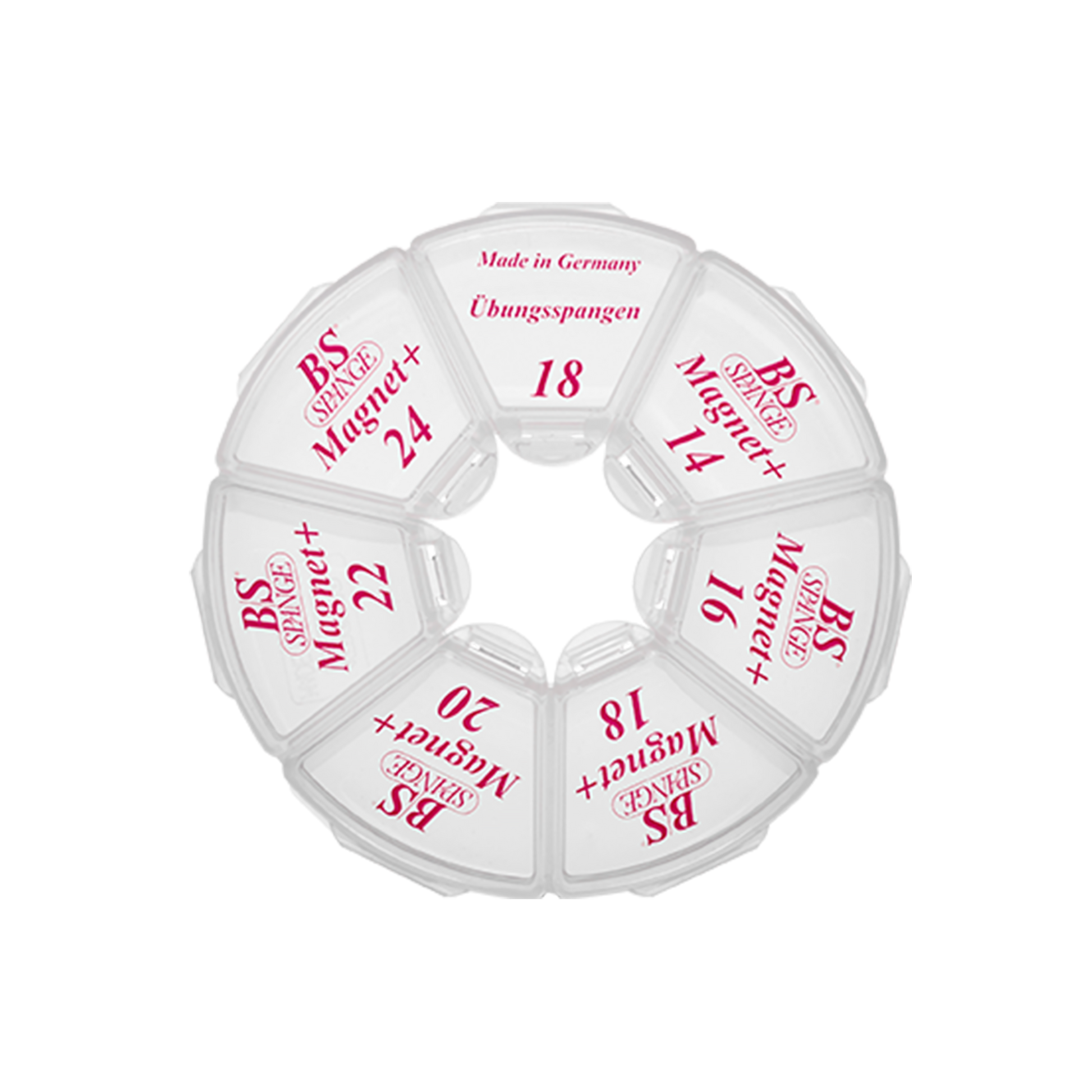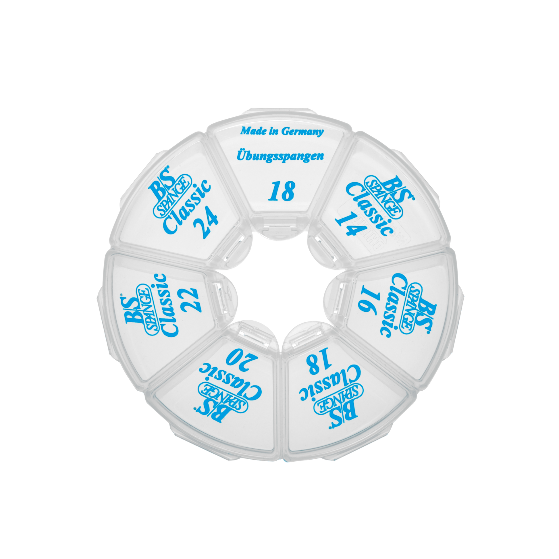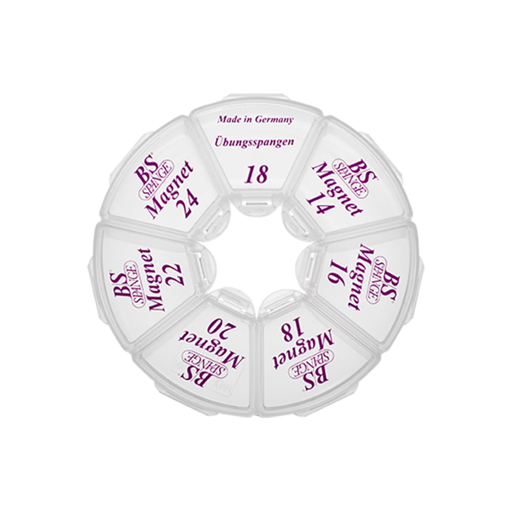 Es bietet eine übersichtliche Aufbewahrung für B/S Spangen aller Größen. Das robuste Rondell sorgt dafür, dass die Spangen geordnet und geschützt gelagert werden können.